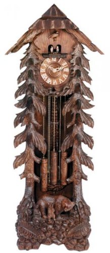 This eight day German grandfather cuckoo clock features wooden hands, a wood dial with Roman numerals. This grandfather clock features a bear family at its base with hand-carved trees rising on each side of the clock and a squirrel in the branches underneath the clock dial. This clock also plays music every fifteen minutes. The dancers revolve on the turntable above the clock dial while the music plays. You can adjust a lever to choose which chime you want the clock to play: Westminster Chime, St. Michael, or Whittington. This clock has a night-shut off switch and silent mode. This clock does not have a moving cuckoo bird or cuckoo sound. It does have a decorative hand-carved bird perched above the dancers. Three weights are suspended beneath the clock dial by three separate brass chains. The hand-carved pendulum continuously swings back and forth which controls the timing of the clock. This grandfather cuckoo clock is powered by an eight day Kieninger clock movement. It is wound by raising the three weights hanging in front of the pendulum. One weight powers the time and pendulum, one powers the music box, and the other weight powers the dancers. *Great effort has been made to portray each grandfather cuckoo clock as accurately as possible. As with many handmade items, the exact coloration and carving may vary slightly from clock to clock. We consider this to be a special part of their character. This clock is covered by a two year limited warranty covering workmanship and manufacturers defects.
